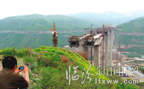 據現場施工的工人介紹,該橋由中鐵十二局集團承建,總投資2億余人民幣,橋梁最高達140余米。按目前的施工進度,預計在8月份整個大橋就合攏了,那時黃河天塹將變通途。