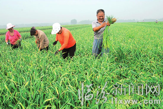 近日,曲沃縣北董鄉西閆村張連軍正在抽蒜薹,老張家有6畝蒜田,僅蒜薹一項每年就可收入9000余元。該鄉已建成大蒜園區2萬余畝,沸泉”牌大蒜,被評為“山西省名牌農產品”,遠銷大同、陜西、內蒙古、河北、廣東等地。 劉紅兵 靳立群 攝