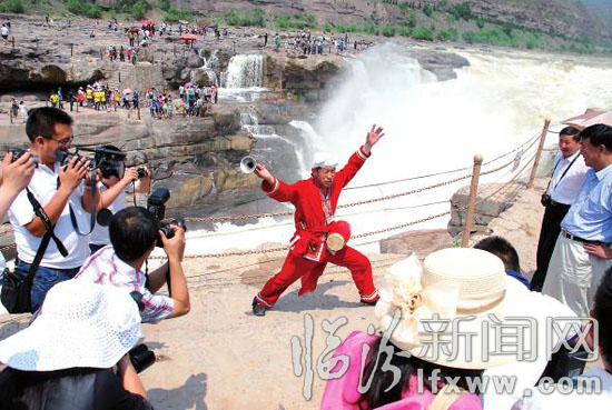 6月22日,端午小長假第一天,民間藝人正在吉縣壺口瀑布表演節目。小長假期間,壺口瀑布迎來了眾多游客,大家紛紛走出戶外,感受大自然的魅力。記者 李自強 攝