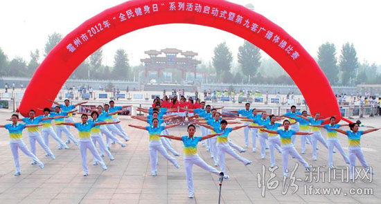 為鼓勵(lì)市民積極健身,日前,霍州市在中鎮(zhèn)文化廣場(chǎng)舉行了2012年“全民健身日”系列活動(dòng)啟動(dòng)儀式即第九套廣播體操比賽,該市住建局、環(huán)保局等13家單位組隊(duì)參加了比賽。圖為比賽現(xiàn)場(chǎng)。