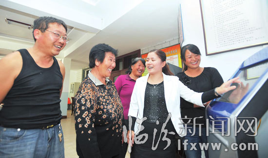 9月13日,在吉縣西關村村委會,果農薛文葉、鄭玉賢、劉富剛、楊麗娟通過陽光農廉網查看蘋果銷售情況。