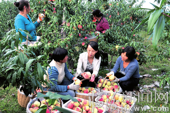堯都區(qū)賀家莊鄉(xiāng)負(fù)責(zé)人在李家莊桃園了解生產(chǎn)情況