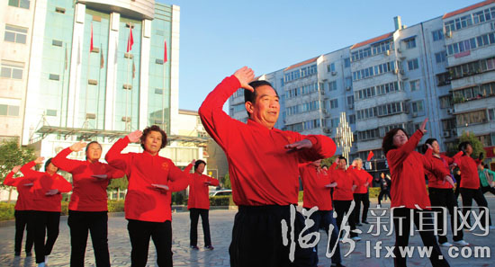 10月31日清晨,堯都區鄉賢街辦事處老年健身隊正在排練健身節目,以廣場舞等表現形式喜迎黨的十八大勝利召開。