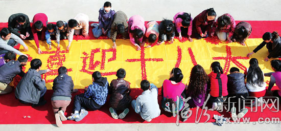 11月5日,市紅絲帶小學的老師們和23名艾滋患兒,用紅絲帶結制作了一幅喜迎“十八大”的圖案,以特殊的方式迎接黨的“十八大”的召開。