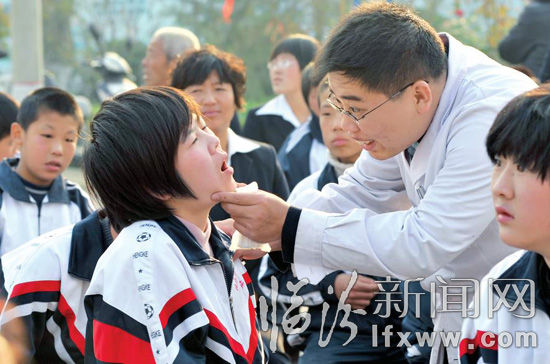 11月6日,我市“共青團與人大代表、政協委員面對面”活動在侯馬特殊教育學校舉辦,活動通過文藝表演、捐贈圖書、健康體檢、發展座談等形式,在給孩子們帶去歡笑和溫暖的同時,也搭建起了弱勢青少年利益訴求表達的新平臺、新渠道。圖為青年醫務志愿者為特教師生進行身體檢查。