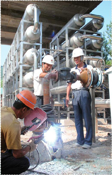 為進(jìn)一步改善居民生活質(zhì)量,蒲縣啟動(dòng)實(shí)施水質(zhì)提升工程,目前新建水源井建設(shè)、水井房已全部完工,部分工程進(jìn)入收尾階段,第一組設(shè)備已試運(yùn)行,東關(guān)片區(qū)居民開(kāi)始用上礦物水。圖為工作人員正在安裝調(diào)試設(shè)備裝置。