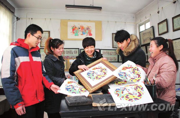 12月23日,在臨汾市平陽木版年畫博物館,年畫制作人員正在展示創作完成的蛇年木版年畫。該年畫由一圓、四色、二十四葉片組成,這些數字、顏色、構圖都蘊含和代表著中國傳統文化的特點。