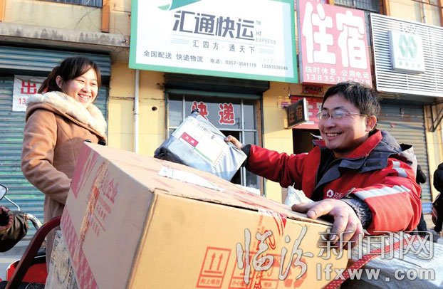 1月9日,在襄汾縣大運路匯通快運部,80后”的夫妻李俊強和喬曉麗在整理顧客要發的快遞。他們二人大學畢業后,選擇了快遞行業,一個記賬,一個送貨,經營起了夫妻檔的快運部,日子雖然辛苦點,但他們靠著勤快、認真、務實的干勁,生意經營的越來越好。(記者 閆銳鵬 攝)