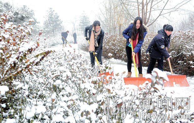 1月21日,古城公園管理處的工作人員在清掃園區(qū)道路的積雪。1月20日,一場(chǎng)大雪不僅將臨汾裝扮得銀裝素裹、格外美麗,還有效緩解了當(dāng)前干燥的氣候,凈化了空氣。氣象部門(mén)提醒民眾,要注意防寒保暖和交通出行安全。記者 閆銳鵬 攝