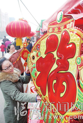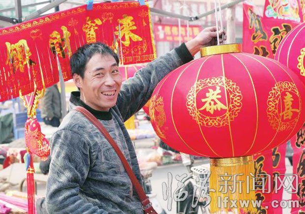 堯都區喬李村的集市上,村民正在挑選大紅燈籠