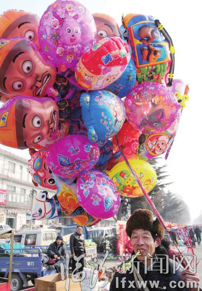 堯都區喬李村集市上,商販正在售賣氣球