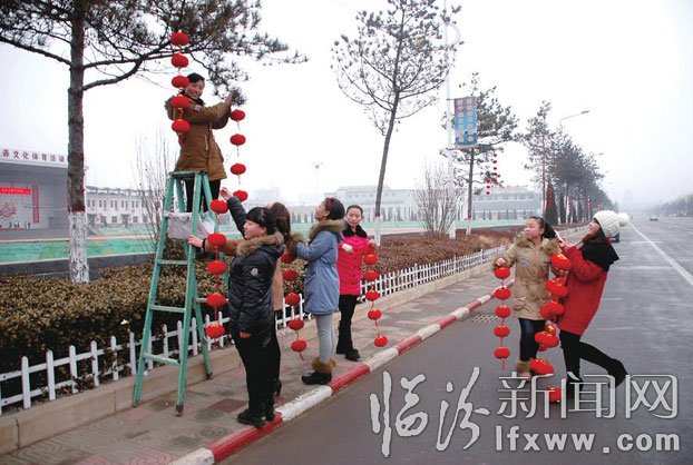 近日,安澤縣文廣新局的職工正在縣文化體育活動中心周圍的樹木上懸掛燈籠,串串大紅燈籠烘托出喜慶的節日氣氛。