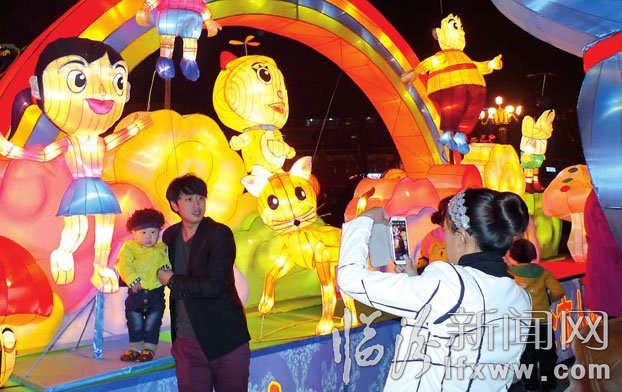 2月18日,市民在鼓樓廣場燈展前合影留念。