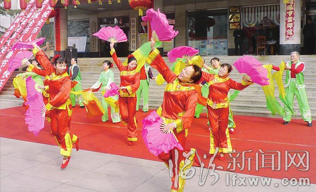 2月15日,市區水塔社區的群眾正在市教育局門前進行文藝表演。