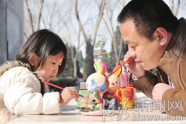 2月15日,在市區濱河游樂場,小朋友和家長正在涂鴉玩樂。