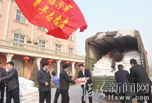 2月22日下午,團市委、市青聯、市青企協將650袋面粉、500箱方便面、500件礦泉水捐贈給洪洞縣甘亭鎮災區人民。圖為志愿者在卸載救災物資。