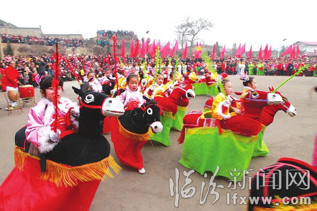 上午10時(shí),2013年“靚麗臨汾”元宵節(jié)社火展演正式開始。第一個(gè)出場的是由200人組成的賈得威風(fēng)鑼鼓,鏗鏘的鑼鼓聲和激昂的旋律奏響了社火的華彩篇章。賈得鄉(xiāng)威風(fēng)鑼鼓藝術(shù),其歷史悠久,曲牌豐富,音域?qū)掗煟瑒倓偶ぐ海瑲鈩莅蹴纾枳藘?yōu)美,列隊(duì)變化多樣,組合圖案清晰,是中國器樂藝術(shù)寶庫中一顆璀璨的明珠。