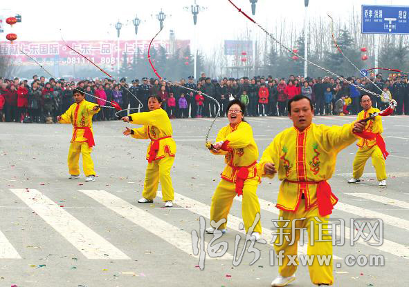 中華麒麟鞭的表演讓在場的市民大開眼界,只見幾名表演者手持由牛皮手柄串聯(lián)不銹鋼鏈尾接尼龍鞭鞘的鞭具,舞起來發(fā)出“啪啪”的巨大響聲,聲音清脆,穿透力極強(qiáng)。同時(shí)中華麒麟鞭強(qiáng)身健體,是一項(xiàng)老少皆宜的功夫運(yùn)動(dòng)。隨著麒麟鞭一起一落,幾名表演者拿在手中的報(bào)紙、氣球被一一打破,一幅“構(gòu)建和諧靚麗臨汾,努力創(chuàng)建美好家園”的條幅緩緩落地,映入人們眼簾。