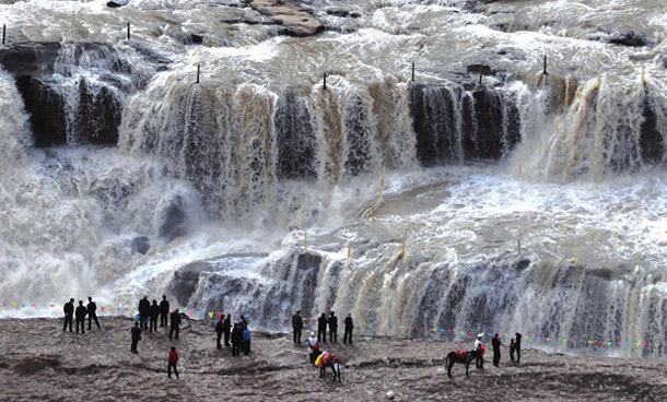 3月18日,游客在山西吉縣欣賞黃河壺口瀑布“桃花汛”。 受近日氣溫回暖影響,位于山西吉縣和陜西宜川縣交界的壺口瀑布迎來五年來最早“桃花汛”,大量槽蓄水奔騰而下,形成壯觀瀑布群,吸引眾多游客前來觀看。 每年三月到四月,黃河內蒙古段冰凌消融形成春汛,由于恰逢黃河沿岸山桃花盛開的季節,故被稱為“桃花汛”。