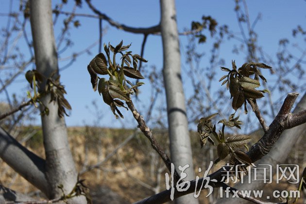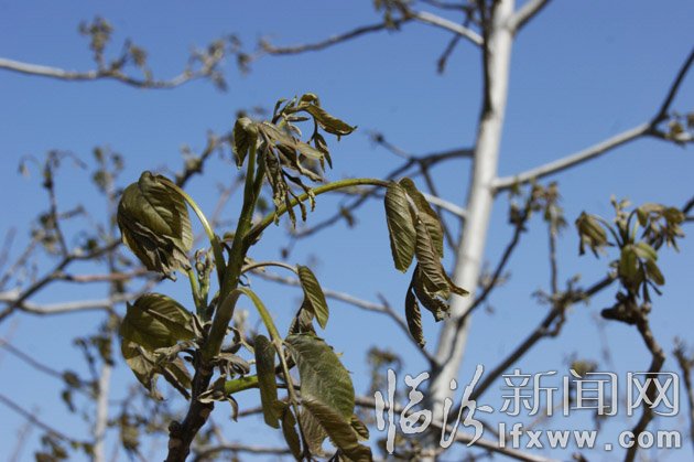 臨汾新聞網訊 (馮振興 攝影報道) 4月7日至9日,北風呼嘯寒潮來襲,氣溫急劇下降,大寧縣的白天氣溫13—16℃,晚上-3℃ — -5℃之間徘徊,8日晚上-5℃水面結薄冰,一夜之間把果花全部凍壞,核桃樹最為嚴重花絮全部萎謝,葉片變黑。核桃樹和花椒樹全無收成。圖為受到寒潮侵襲的核桃樹。