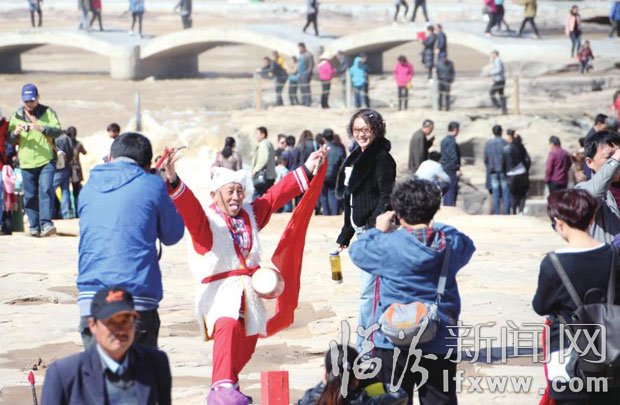 4月6日,在吉縣黃河壺口瀑布景區,游客在拍照留念。清明小長假期間,受高速路免費通行自駕游劇增的影響,吉縣黃河壺口瀑布景區迎來旅游高峰,景區也增設了民俗表演和游客互動參與活動,吸引了眾多游客體驗參與。(記者 閆銳鵬 攝)