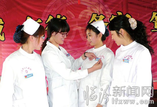 日前,侯馬團市委在侯馬人民醫院舉辦了“青年愛心崗”授牌儀式,號召醫院護士立志當好愛心使者和精神文明的傳播者,全心服務患者。圖為該院青年護士正在佩戴“青年愛心崗”胸章。