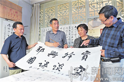 五月二十日,市書(shū)協(xié)會(huì)員賀建中(左一)郭波(右一)與市老年書(shū)協(xié)副主席王忠孝(左二)一起交流書(shū)法作品。近年來(lái), 我市書(shū)法家協(xié)會(huì)會(huì)員在提高自己書(shū)法水平的同時(shí),增強(qiáng)與各協(xié)會(huì)的書(shū)法技藝交流,搭建交流平臺(tái),營(yíng)造良好的書(shū)法氛圍,全面打造我市的書(shū)法品牌。記者 閆銳鵬 攝