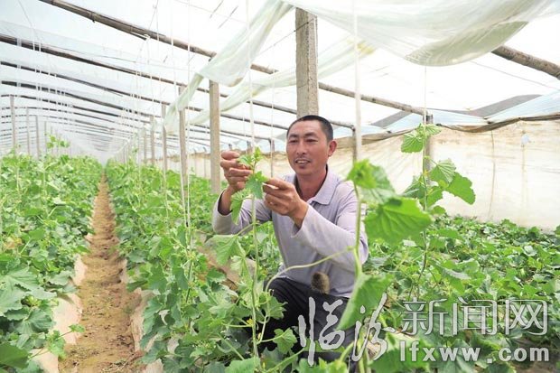 隰縣午城鎮桑梓村在“一村一品”目標的引領下,因地制宜發展林果業,使村民們山上種梨樹,山下種大棚,積極為農民搭建平臺,帶動農民脫貧致富。短短的一年時間,全村建起了870座瓜菜大棚,每座大棚年收入可達1.5萬元以上。圖為桑梓村村民在自家的大棚內查看瓜果長勢。