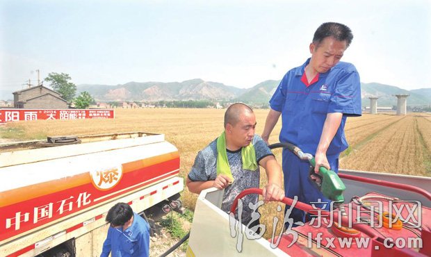 6月3日,中石化臨汾石油分公司夏收服務(wù)隊(duì)在侯馬市上馬辦事處驛橋村麥田為收割機(jī)加油。夏收以來,該公司組織開展“方便農(nóng)機(jī)戶,服務(wù)到地頭”專項(xiàng)支農(nóng)活動(dòng),確定定點(diǎn)支農(nóng)加油站42座,開辟農(nóng)機(jī)用油專用通道、設(shè)置支農(nóng)服務(wù)臺(tái),并組織40余輛配送車奔赴夏收一線,送油到田間地頭。