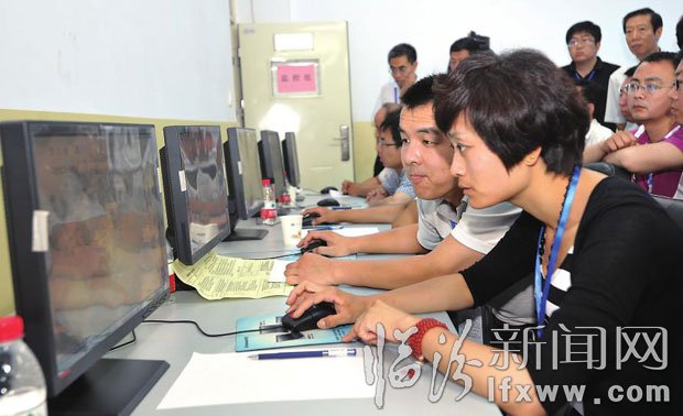 在臨汾第一中學考點,監考老師通過監控視頻對考場進行監考。記者 李虎威 攝