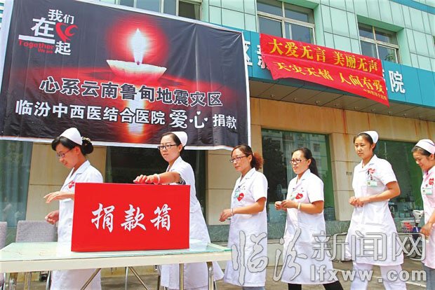 8月9日,臨汾中西醫(yī)結(jié)合醫(yī)院的醫(yī)護(hù)人員在為云南魯?shù)榈卣馂?zāi)區(qū)捐款。
