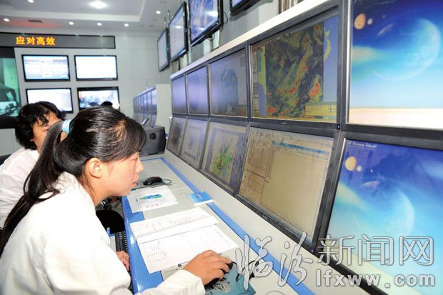 圖為市氣象臺的工作人員在觀測云層走勢情況。記者 魏華 攝