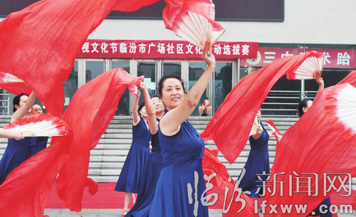 7月27日,市政府桂珍模特舞蹈隊在表演舞蹈《祖國萬歲》。當日,山西省社區電視文化節臨汾賽區選拔賽開賽,由群眾自導自演的社區文化活動在市府小區精彩上演。從民族味的舞蹈到現代味十足的“騎馬舞”等多彩的節目為社區居民帶來一道文化盛宴。記者 李虎威 攝