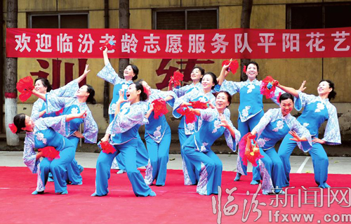 7月30日,在我市軍民聯歡文藝演出中,臨汾平陽花巾幗志愿者文藝隊在表演舞蹈《老媽媽》。當日,我市老齡志愿者協會和臨汾平陽花藝術團走進武警臨汾市支隊,10支藝術團體和武警戰士表演了精彩的節目,慶祝“八一”建軍節的到來。 記者 閆銳鵬 實習生 張榮 攝