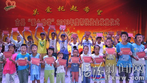 當日,古縣舉行“愛心助學”2013年幫扶資金發放儀式。今年,古縣創建了“愛心助學基金”,全縣5000余名干部、群眾和企業家共捐善款817079元,這些善款將逐年資助全縣貧困學生。記者李虎威攝