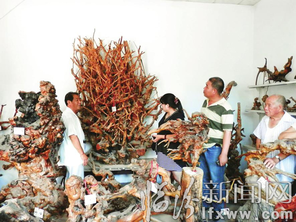 襄汾縣固城鎮盤道村的村民王紀元,許多年來一直潛心根雕收藏,在他的根雕工作室里,上千件根雕作品栩栩如生,有九天翱翔的蒼鷹,有海底美麗的珊瑚,還有傳說中的八仙……圖為王紀元(左一)在為大家介紹他收藏的千年古柿子樹根。記者 劉晚 攝
