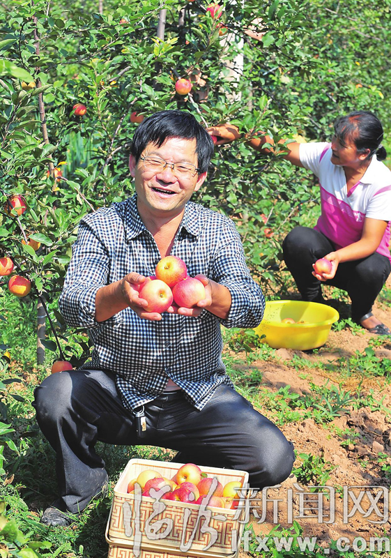 8月26日,安澤縣天樂農民綜合服務專業合作社理事長尉昌華手捧剛剛采摘的蘋果喜笑顏開。天樂農民綜合服務專業合作社3年前創建了占地300畝的蘋果示范園,結束了全縣沒有成規模蘋果園的歷史,經過精心管護,今年合作社的果樹全部掛果,并已獲得農業部農產品質量安全中心的無公害農產品認證。蘇曉峰 攝