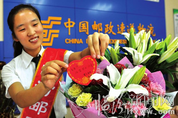 “李老師,祝您節日快樂!”9月9日下午,市郵政局郵政禮儀門市部接到了來自全市各個學校學生的訂花請求,工作人員一邊收拾眼前的鮮花,一邊給一位老師撥打電話,代表客戶送上祝福。