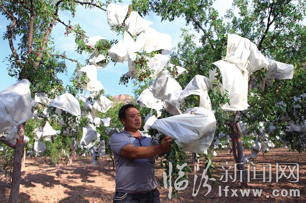眼下正是紅棗成熟的季節,為了使棗農有個好收成,連日來,永和縣林業局技術人員在有名的棗鄉——打石腰鄉河澮里村為700余畝紅棗套袋16萬個,防止紅棗裂果。圖為技術人員正在給紅棗套袋。馮三平 攝