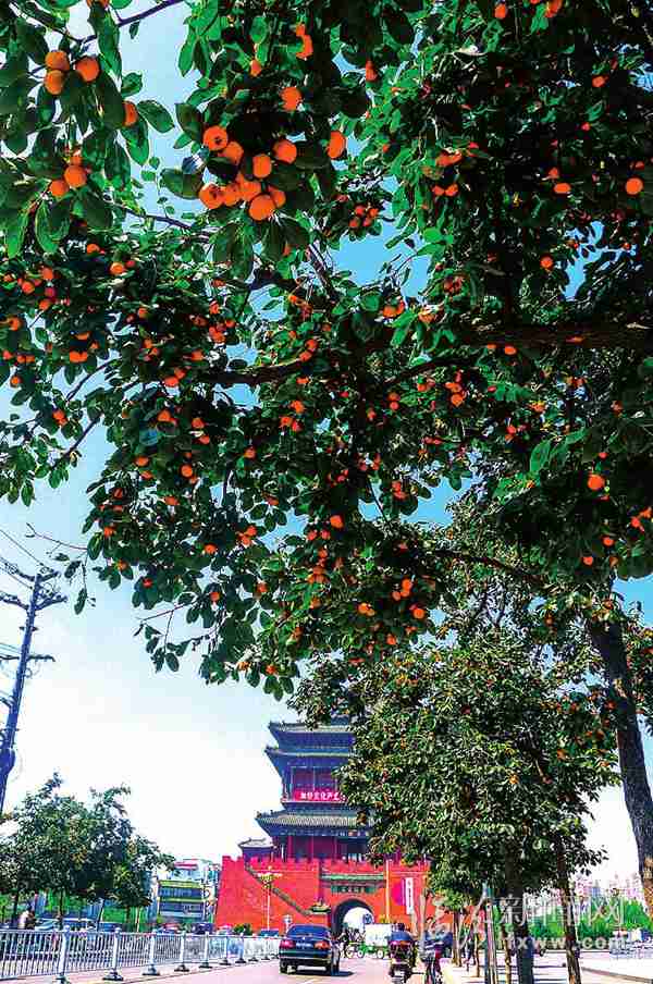 10月7日,路旁行道樹上一簇簇紅彤彤的柿子和笑顏綻放的石榴掛滿枝頭,在湛藍的天空下裝點得整個城市更加美麗,讓“花果城”更加名副其實。