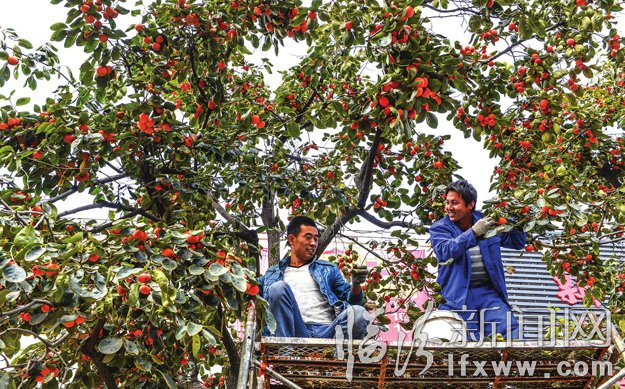 金秋十月,花果城里瓜果飄香,紅彤彤的柿子掛滿了枝頭。10月11日,臨汾市城市綠化隊工作人員開始對我市的鼓樓東大街、洪家樓北街等幾條街道的柿子樹進行采摘,并發放給市民。 記者 張蘊強 攝