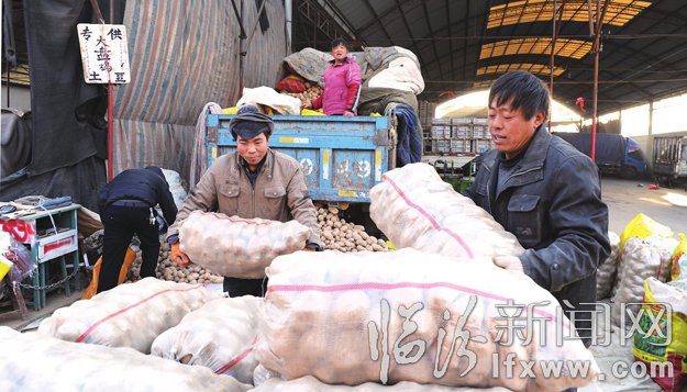 12月8日,在我市堯豐蔬菜批發(fā)市場,商戶正在裝卸土豆。連日來,堯豐蔬菜批發(fā)市場為了防止因氣候變冷影響市民“菜籃子”的情況發(fā)生,積極調(diào)運(yùn)各種蔬菜,保障市民冬季蔬菜供應(yīng)。