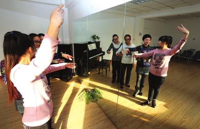 “每天早晨6點(diǎn)起床,下午5點(diǎn)下課,白天在金話筒培訓(xùn)專業(yè)課,晚上再回新立學(xué)校上文化課。”在形體室,郭妍一邊介紹著自己和同伴的作息時(shí)間,一邊練習(xí)著形體?!皞淇忌睿o張有趣!”郭妍說,盡管專業(yè)課占據(jù)了她們的大部分時(shí)間,但是文化課一點(diǎn)也沒有落下。