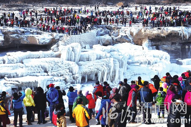1月2日,眾多游客聚集在吉縣黃河壺口瀑布欣賞、拍攝冰瀑奇觀。元旦小長假期間,黃河壺口瀑布呈現出一片銀裝素裹的奇特景象,大面積的冰瀑、冰雕奇觀吸引了全國各地大批游客和攝影愛好者前往。呂桂明 攝