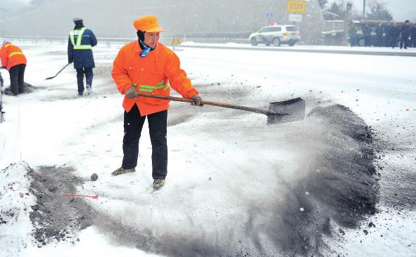 市公路局路政支隊的工作人員在為冰雪路面撒融雪劑。