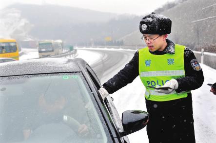 上圖為堯都區交警大隊民警在疏導冰雪天氣中堵塞的車輛。