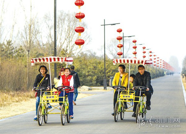 為了迎接農歷羊年的到來,臨汾汾河公園內掛起了象征著喜氣年味的大紅燈籠,以進一步營造濃厚的春節氛圍。圖為2月14日,在汾河景區內,市民正在騎觀光車游玩。 記者 張蘊強 攝