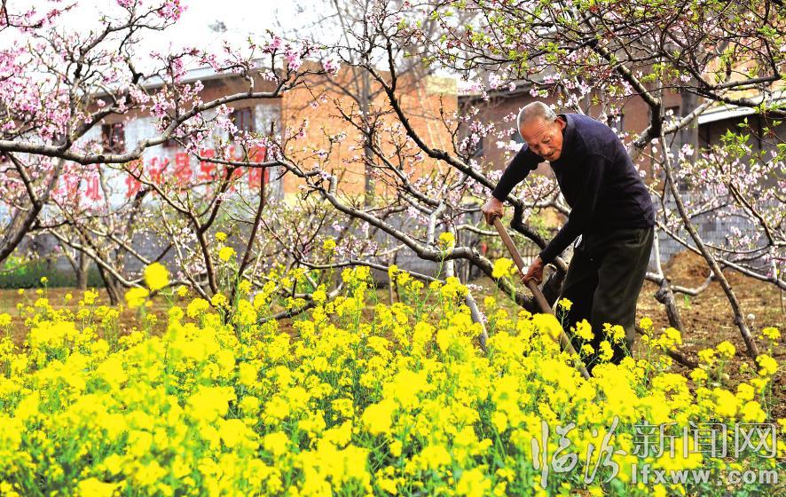 日前,在襄汾縣陶寺鄉陶寺村,一位村民在田間勞作。春日里,田間地頭辛勤耕作的農民身影和盛開的油菜花、桃花構成一幅田園美景圖。