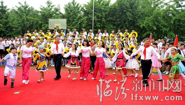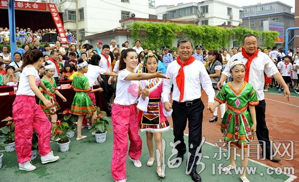 圖為市領導在市第一小學和孩子們一起參加“六一”兒童節(jié)慶祝活動。