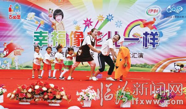 6月1日,市區萊茵半島幼兒園舉行系列活動,慶祝“六一兒童節”的到來。圖為該校師生一起表演情景劇《拔蘿卜》。 記者 劉靜 攝
